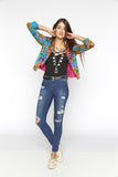 Inspired by Chinese antique kimonos, you’ll love this folky blazer with cute handmade rope frog closures on the front. With its three quarter length sleeves and such vibrant colours inside and out, you’ll have a waist-length wild card for both casual and formal events. The perfect touch of colour your winter outfits have longed for!