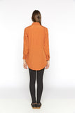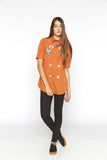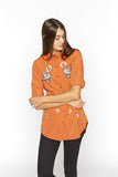 You’ll fall in love with the fit of this floral and barn swallows embroidered blouse. In a trendy tangerine shade, what a cool twist to your regular long-shirt. The flattering short front, long back style allows you to match it with anything you want: jeans, leggings, even shorts! A timeless work-to- weekend uniform.